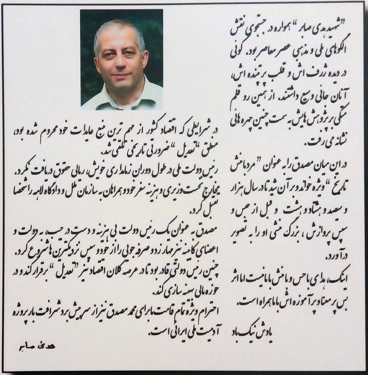 مستند «مصدق از نگاهی دیگر؛ دریچهای بر منش، روش و بینش» اثر شهید هدی صابر منتشر شد. این فیلم مستند حاصل گفتوگوی هدی صابر با شمار زیادی از نزدیکان و مصاحبان مرحوم محمد مصدق ـ نخستوزیر دولت ملی ایران ـ در دوران تبعید و حصر در احمدآباد پس از کودتای ننگین ۲۸ مرداد ۱۳۳۲ تا پایان حیات رهبر نهضت ملی ایران است. در این مستند که طی سالهای ۱۳۸۹-۱۳۸۸ تهیه شده، هدی صابر با کسانی چون محمود مصدق (نوه دکتر مصدق)، سروان موسی مهران فشارکی (فرمانده گارد حفاظت از نخستوزیری)، نصراله خازنی (رئیس دفتر مصدق در دوران نخستوزیری)، حسین شاهحسینی (پیشکسوت و عضو شورای مرکزی و نایب رئیس جبهه ملی)، ابوالفتح تکروستا (آشپز قلعه احمدآباد)، کشور بیگپور (از خدمتگزاران قلعه احمدآباد)، مشهدی حسن (اهل روستای احمدآباد)، سید علیاکبر طالبی (از معمرین روستای احمدآباد و از کارکنان قلعه)، کرمعلی معافی (از خدمتگزاران قلعه احمدآباد)، آقای کشاورز (از خدمتگزاران قلعه احمدآباد) و دکتر اسماعیل یزدی (پزشک معالج دکتر مصدق) گفتوگو کرده است. این گفتوگوها حاوی جزئیات ناگفته و قابل تاملی از منش و سلوک شخصی مرحوم مصدق است که بیانگر مردمداری، سلامت و انضباط مالی، برخورد انسانی و صمیمانه و سخاوتمندانه با زیردستان، پرهیز از سوءاستفاده از موقعیت شخصی، برخورد تعالیبخش با ضعفهای اخلاقی اطرافیان، تاکید بر قانون در امور روزمره و جزئی و ویژگیهای متعدد منحصر به فرد این شخصیت سیاسی ایران معاصر است.