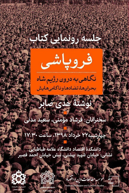 فرشاد مومنی عضو هیئت علمی دانشکده اقتصاد دانشگاه علامه طباطبایی و سعید مدنی پژوهشگر حوزه جامعهشناسی در مراسم رونمایی کتاب «فروپاشی» سخنرانی خواهند کرد. به گزارش خبرگزاری کتاب ایران (ایبنا) روز چهارشنبه ۲۲ خرداد ۱۳۹۸ از ساعت ۱۷ و ۳۰ دقیقه دانشکده اقتصاد دانشگاه علامه طباطبایی میزبان نشست رونمایی کتاب «فروپاشی؛ نگاهی به درون رژیم شاه بحرانها، تضادها و ناکامیهایش» خواهد بود. کتاب «فروپاشی» حاصل پژوهشها و تاملات هدی صابر در زمینه علل و عوامل فروپاشی رژیم پهلوی است و از جنبههای اقتصادی و اجتماعی به این موضوع میپردازد. این کتاب در بنگاه ترجمه و نشر پارسه و همزمان با مراسم رونمایی آن منتشر خواهد شد. در مراسم رونمایی کتاب فرشاد مومنی عضو هیئت علمی دانشکده اقتصاد دانشگاه علامه طباطبایی و سعید مدنی پژوهشگر حوزه جامعهشناسی سخنرانی خواهند کرد.